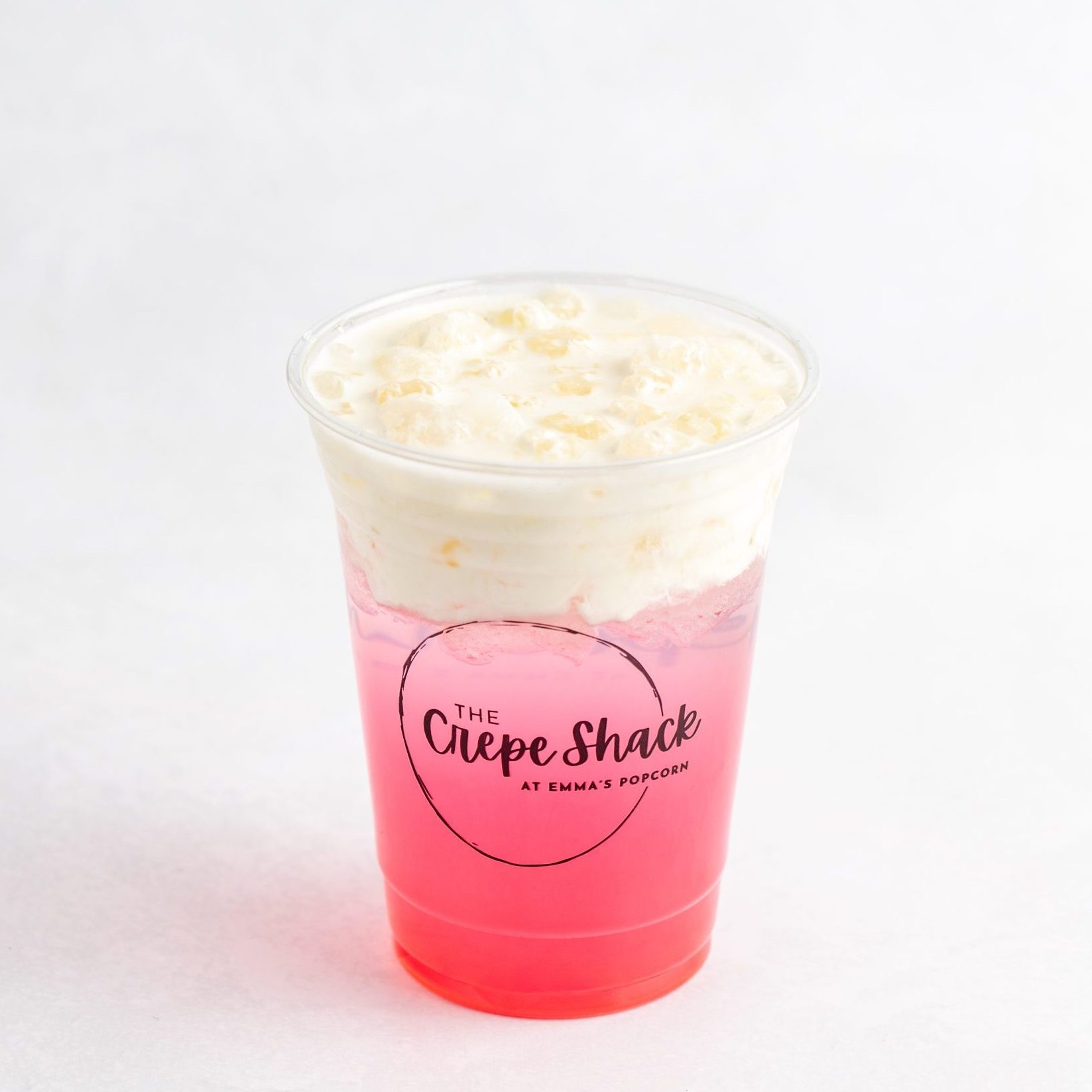 Pink lotus, peach & Vanilla flavors. Topped with cream.