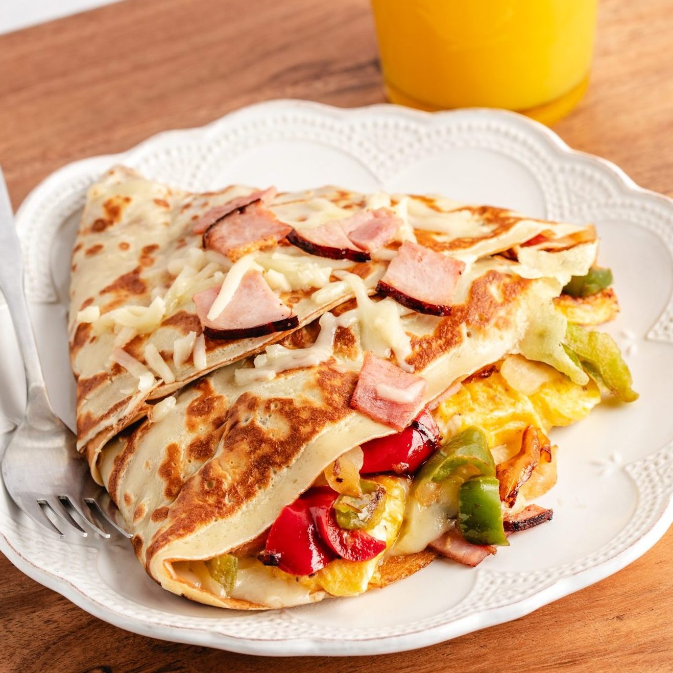 2 Eggs, bacon or ham, cheese, peppers & onions