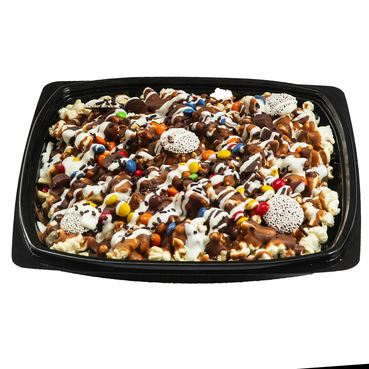 It’s Party Time! This 13 in.Party tray is layered with Sweet & Salty popcorn, drizzled with milk chocolate, and peanut butter chocolate, topped with theme colored assorted candies, and garnished with white chocolate and sprinkles. Try this for a unconventional birthday cake, hostess gift, teacher gift, office party and more! This product is gluten free.
