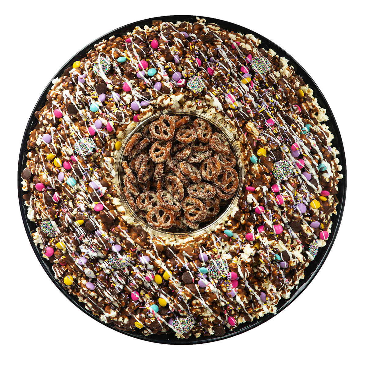 Its Party Time! This 18” party tray is loaded with yummy! Sweet & Salty popcorn, drizzled with creamy milk & PB chocolate, topped with assorted candies, garnished with white chocolate and sprinkles. In the center you will find our deliciously seasoned pretzels!