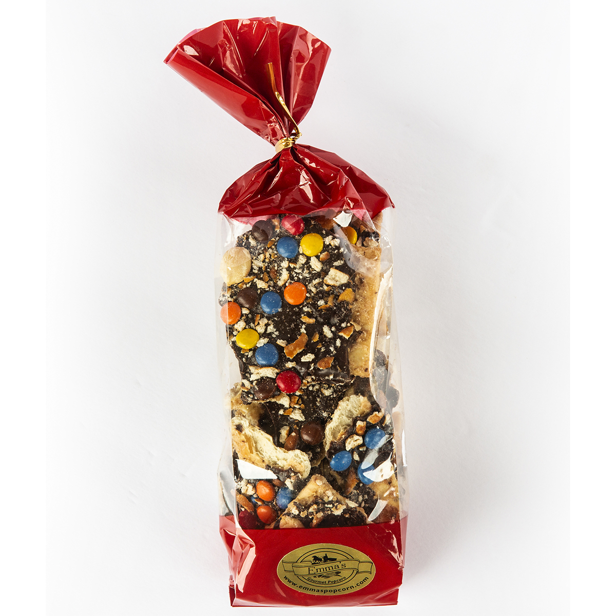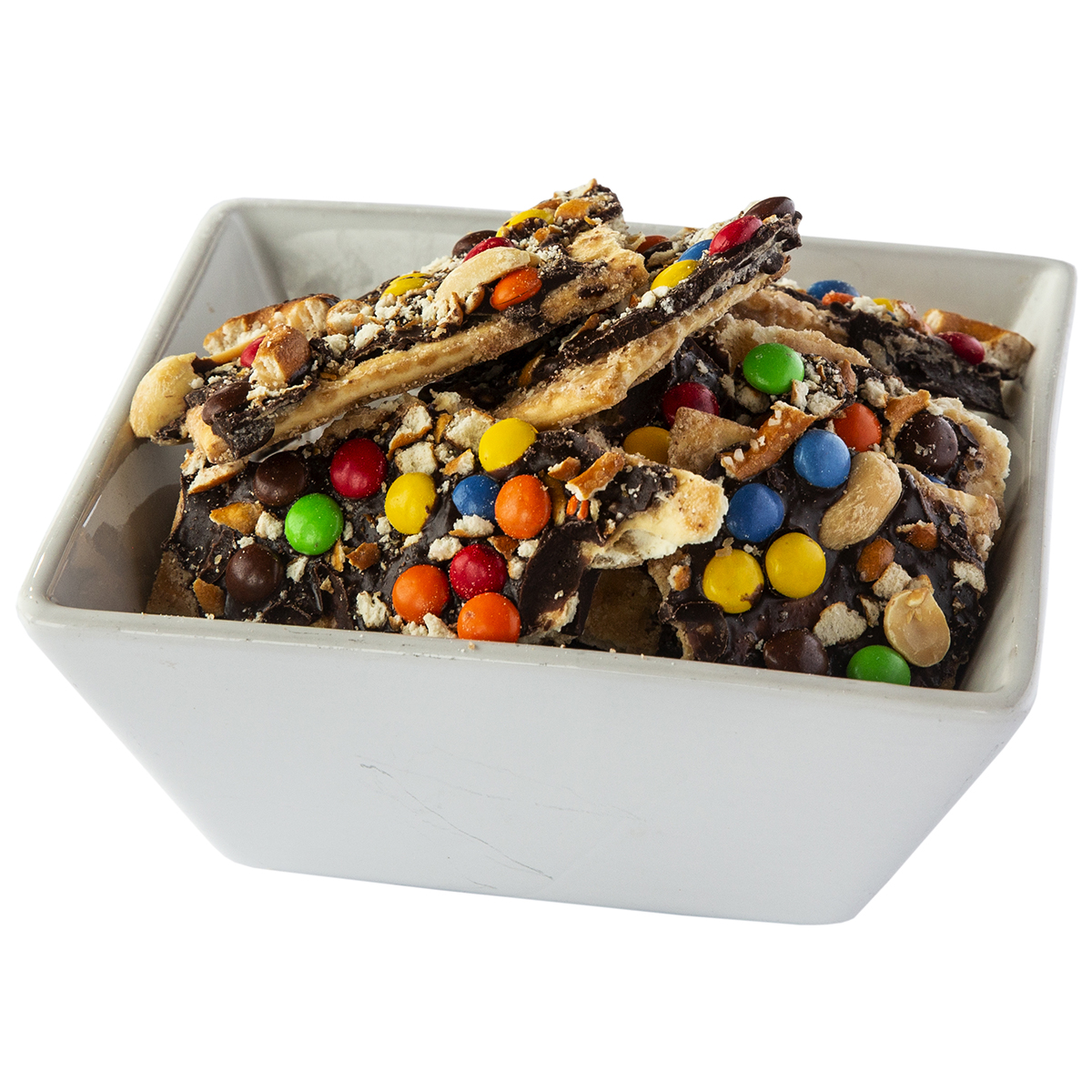 Crunchy cracker base is loaded with caramel, dark Chocolate, semi sweet candy, and peanuts. Yum-m-m!